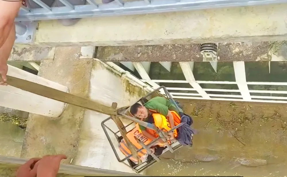 Ở dưới sông, ông anh Nguyễn Thế Vinh (48 tuổi, làm nghề lái xe dịch vụ) dùng dây dù hỗ trợ ông Lâm Văn Dư (41 tuổi, nhân viên Xí nghiệp Thủy lợi 5) lao vào trong dòng nước xiết để tiếp cận nạn nhân, đưa nạn nhân vào bờ.