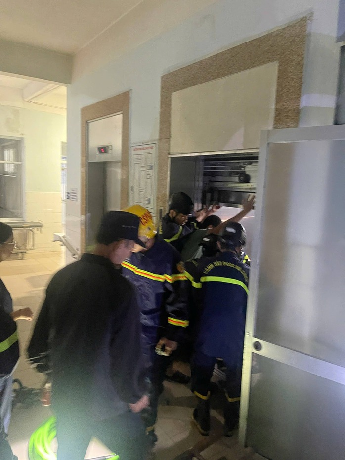 Qua trinh sát nhanh, xác định trong cabin thang máy có 3 người bị mắc kẹt, gồm 2 bệnh nhân và 1 nhân viên y tế. Do không gian kín, thời gian mắc kẹt kéo dài, các nạn nhân có biểu hiện lo lắng, hoảng sợ.