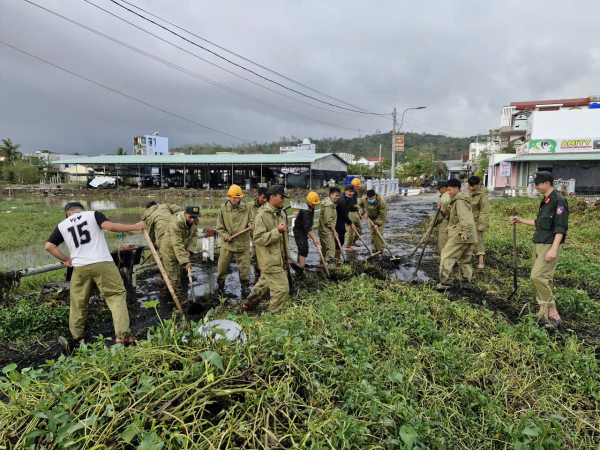 Công an tỉnh Đắk Lắk thu dọn vệ sinh do lũ lụt bồi lấp ở xã Tuy An Đông.