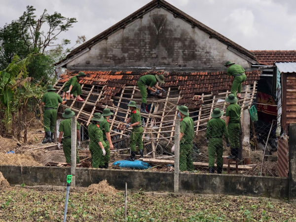 Cán bộ, chiến sĩ Công an tỉnh Đắk Lắk hỗ trợ người dân dọn dẹp, sửa lại nhà sau cơn lũ lịch sử.