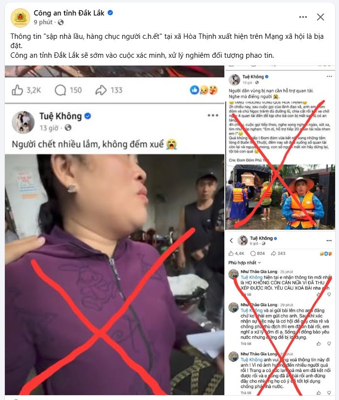 Trang thông tin facebook chính thức của Công an tỉnh Đắk Lắk cũng vừa chia sẻ: Các thông tin “sập nhà dân, hàng chục người chết” tại xã Hòa Thịnh xuất hiện trên mạng xã hội là bịa đặt. Công an tỉnh sẽ sớm vào cuộc xác minh, xử lý nghiêm đối tượng phao tin.