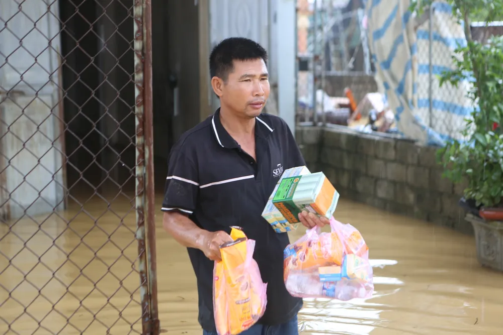 Do nhà dân ở xa vị trí thuyền cứu trợ, Đại úy Hoàng Văn Sỹ xuống thuyền mang theo bánh ngọt, nước uống vào nhà dân.