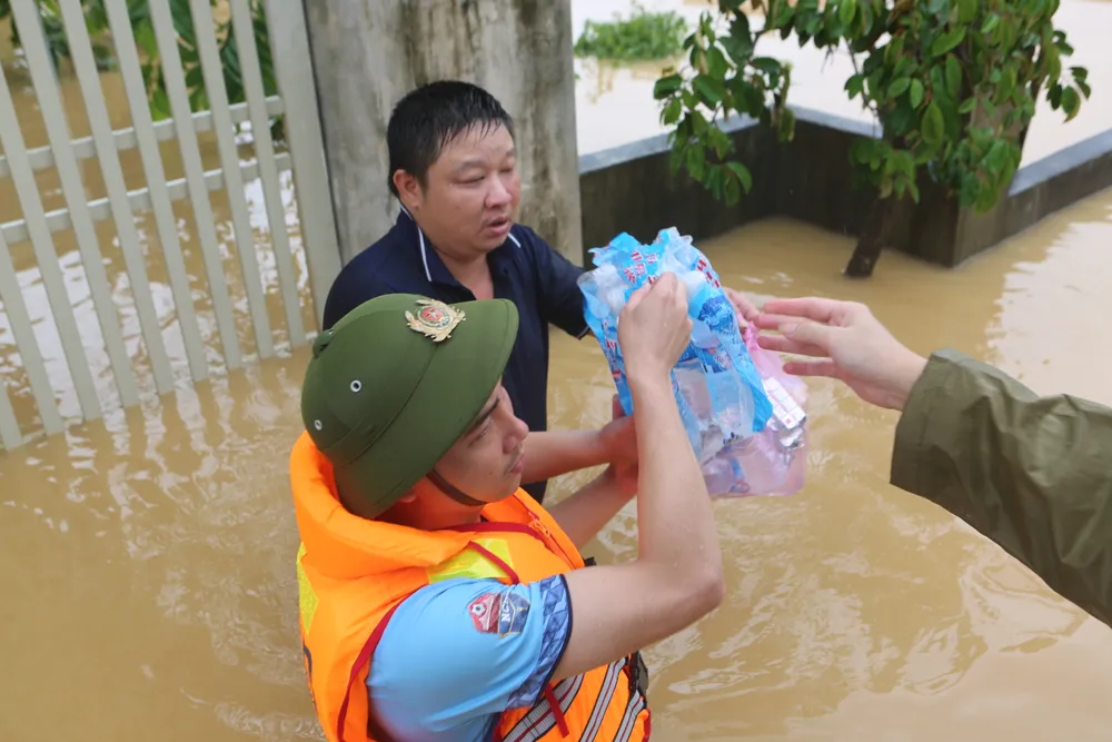 Công an mang mì tôm, nước uống, lương khô cho người dân vùng lũ