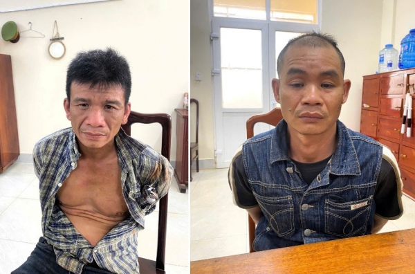 Đối tượng Lê Văn Hậu (bên trái) và Trịnh Văn Chiêm (bên phải) tại cơ quan Công an.