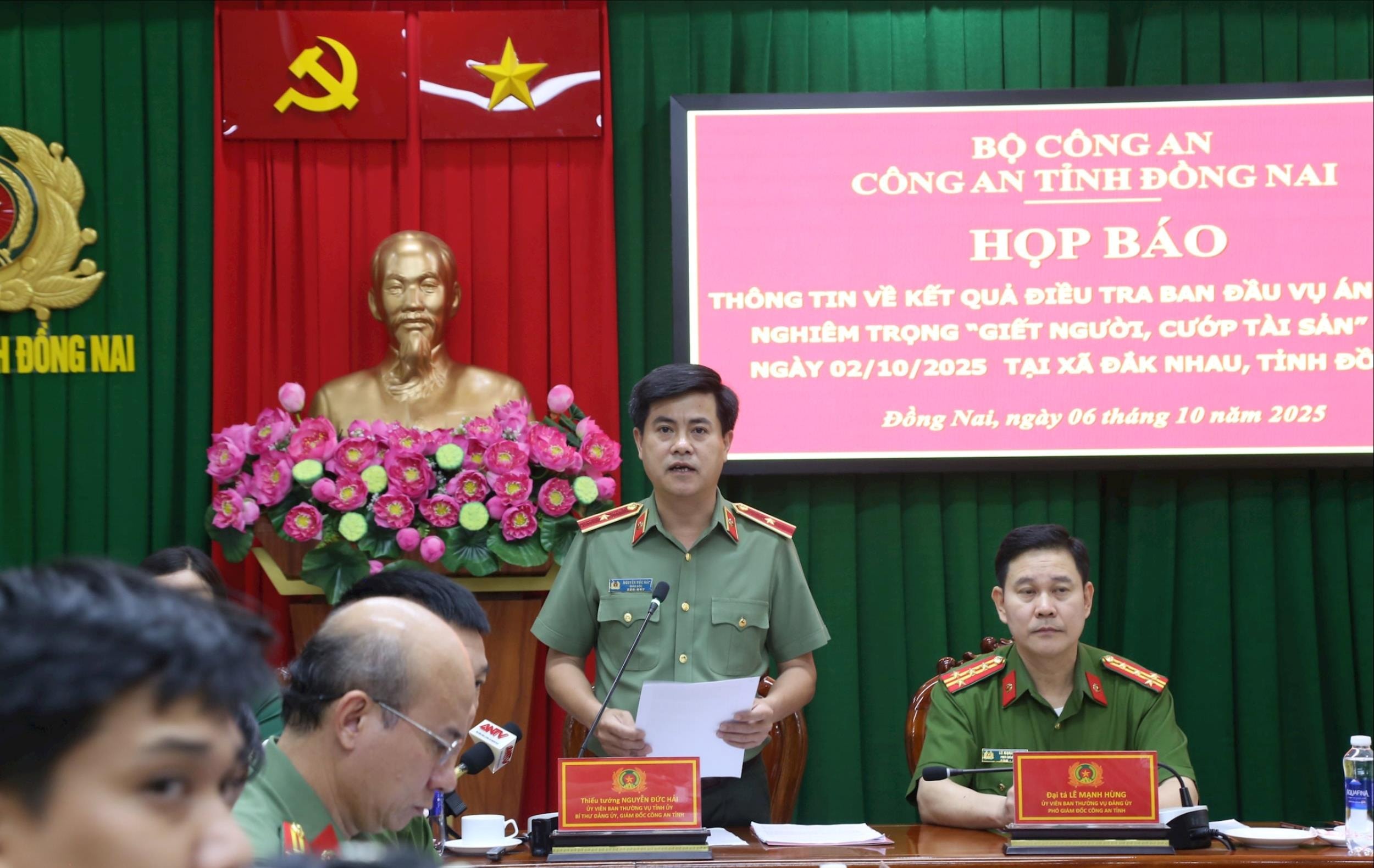 Chiều 6/10, Công an tỉnh Đồng Nai tổ chức họp báo thông tin về kết quả điều tra ban đầu vụ án đặc biệt nghiêm trọng Giết người; Cướp tài sản xảy ra ngày 2/10/2025 tại xã Đắk Nhau.