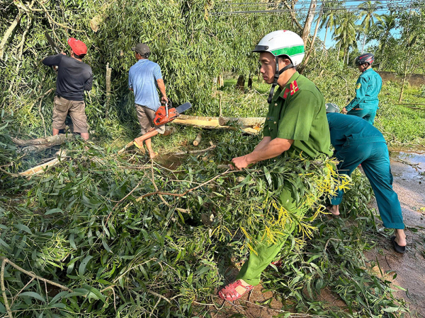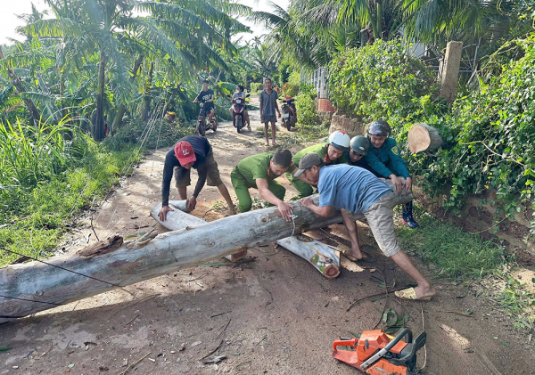 Lực lượng Công an hỗ trợ người dân dọn dẹp cây cối đổ rạp xuống đường gây cản trở giao thông.