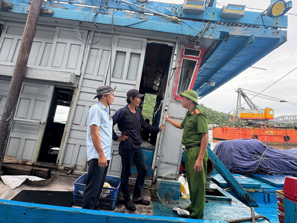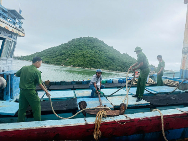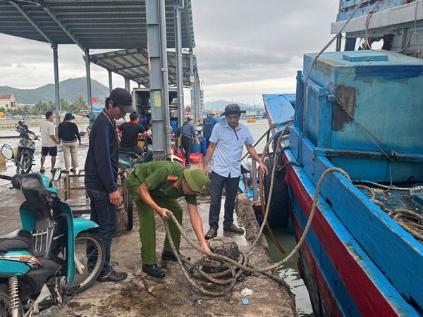 Cán bộ Công an hướng dẫn, hỗ trợ ngư dân neo đậu tàu thuyền tránh bão.