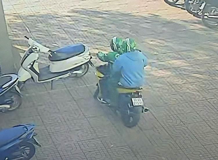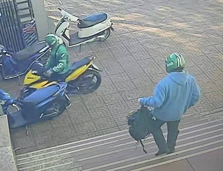 Các đối tượng mặc áo khoác của hãng Grab, đội mũ bảo hiểm màu xanh Grab, nghi sử dụng xe mô tô nhãn hiệu Exciter màu vàng – đen, biển kiểm soát 77G1 – 31312 và mang theo một túi xách màu xanh (dạng ba lô con cóc) dừng xe trước cửa Phòng Giao dịch Trà Bá, sau đó cả hai đi vào trong khu vực các quầy giao dịch của Ngân hàng.