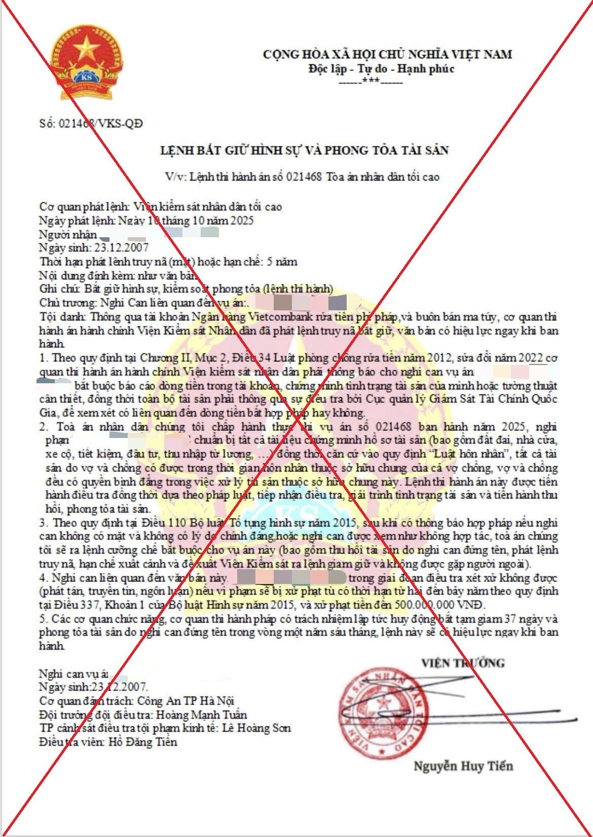 Lệnh bắt giữ và phong tỏa tài sản do các đối tượng làm giả để hù dọa nhóm sinh viên.