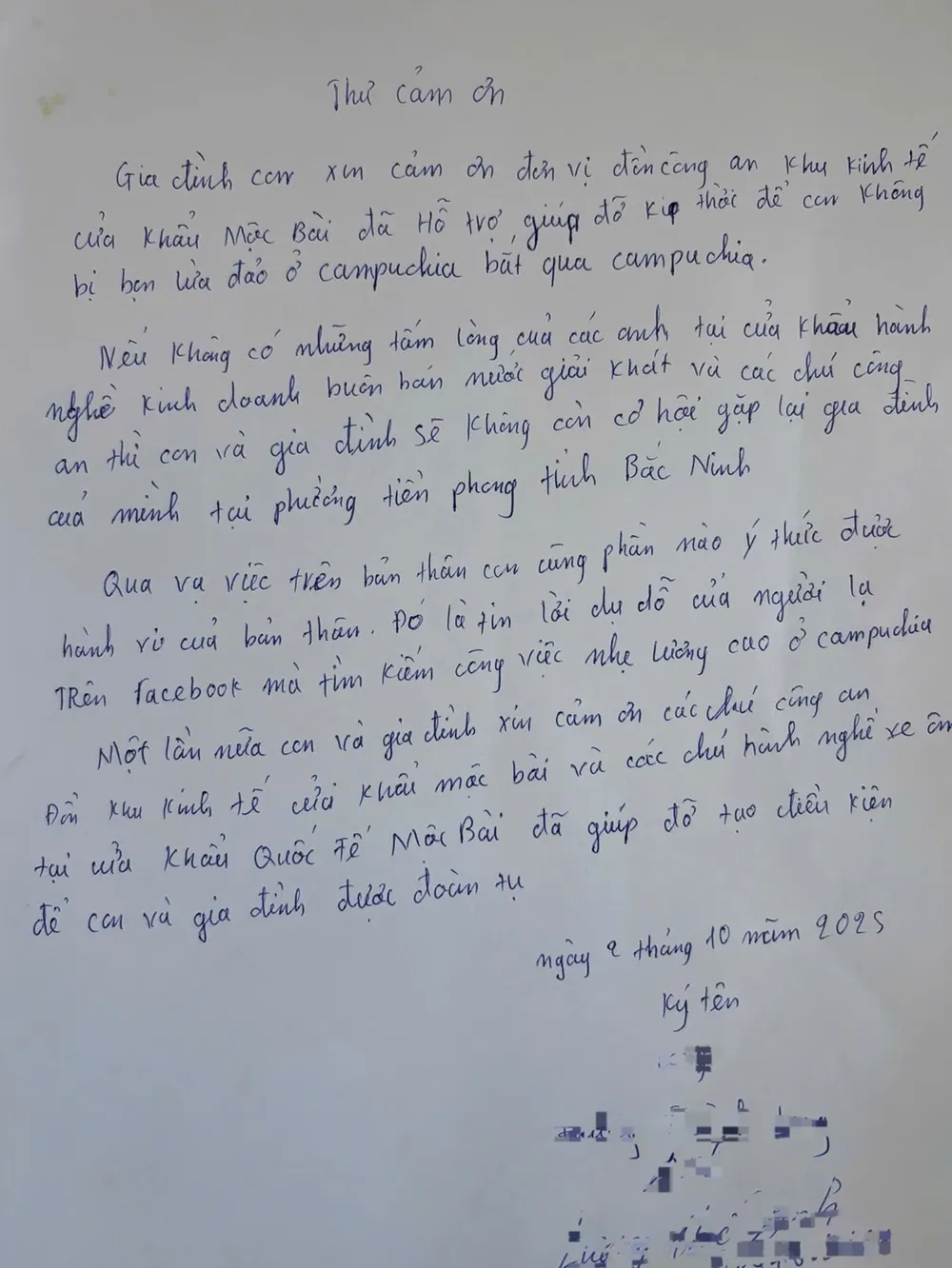 Thư cảm ơn của gia đình em L gửi Đồn Công an KKTCK Mộc Bài. Ảnh: CA
