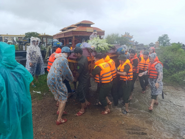 Dưới cơn mưa nặng hạt, các chiến sĩ len lỏi giữa biển nước mênh mông, cùng người dân khiêng quan tài, dò từng bước chậm rãi, vững chãi vượt qua quãng đường ngập sâu để đến nghĩa trang. Hình ảnh những cán bộ, chiến sĩ Công an lặng lẽ dầm mình trong nước lũ, dìu nhau qua từng đoạn ngập, vừa giữ thăng bằng cho linh cữu không bị trôi, khiến nhiều người chứng kiến không khỏi xúc động, cảm phục.