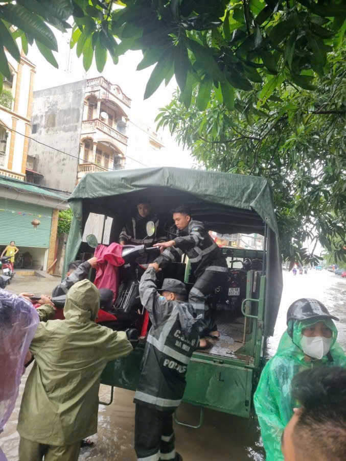 Tại phường Hà Đông sáng nay, nhiều tuyến phố Phùng Hưng, Xa La ngập sâu. Một số người già và trẻ em đang trên đường đi cấp cứu, sản phụ đến bệnh viện được cán bộ Phòng CSGT dùng ô tô chuyên dụng đưa qua điểm ngập lụt. Tổ công tác Đội CSGT đường bộ số 7 hỗ trợ kịp thời bệnh nhân gãy xương đùi, chuyển từ tuyến tỉnh cấp cứu tại Bệnh viện 103.
