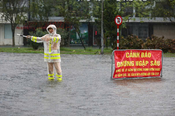 Cảnh sát cơ động phối hợp các lực lượng trực tại những điểm úng, ngập phân luồng giao thông, kịp thời hỗ trợ nhân dân.