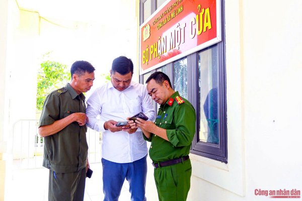 Cán bộ Công an hướng dẫn người dân đến làm sạch dữ liệu ở Trụ sở Công an xã.