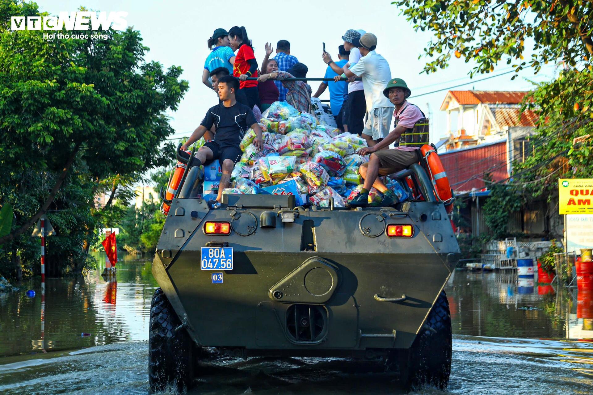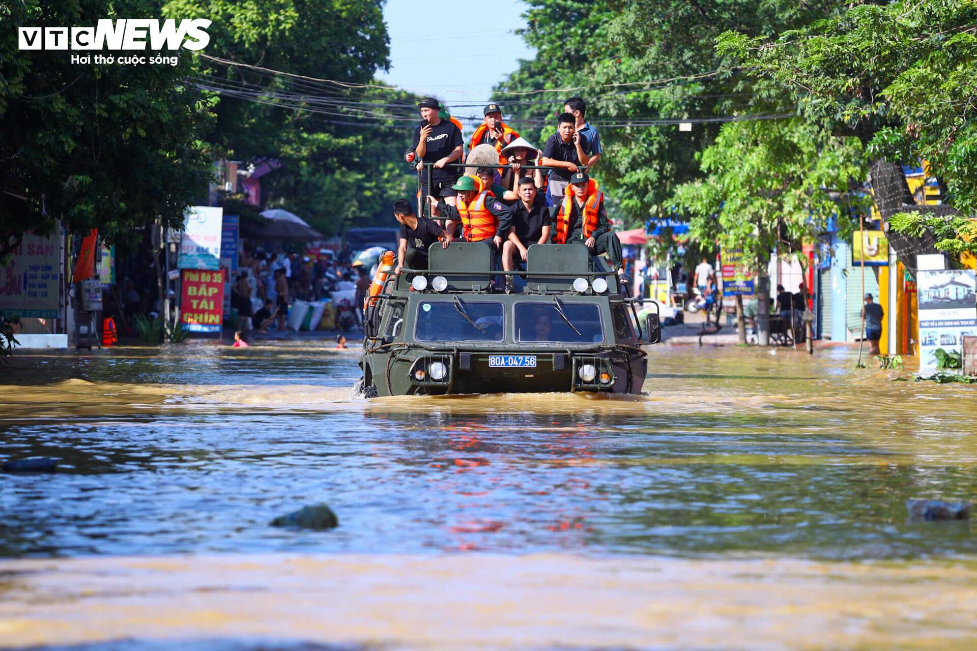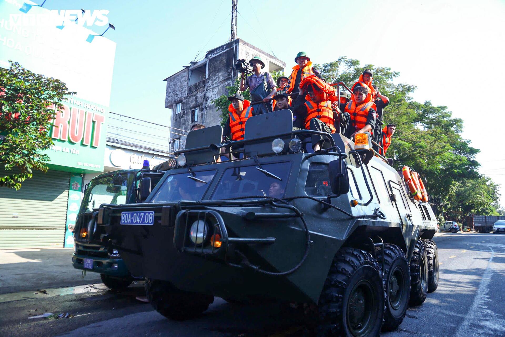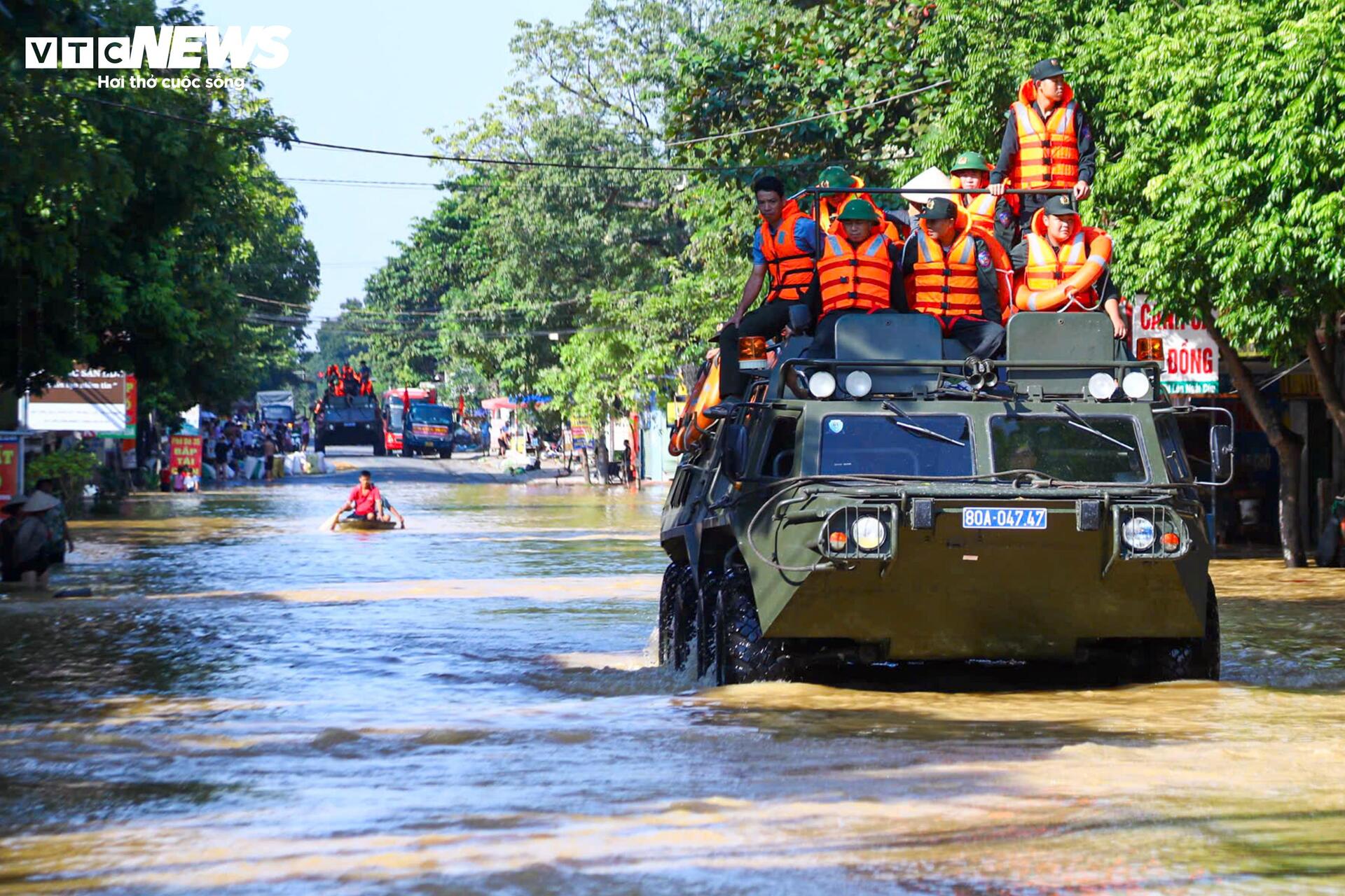 Không chỉ sơ tán người dân, các chiến sĩ còn sử dụng xe chuyên dụng để vận chuyển hàng hóa, lương thực và nhu yếu phẩm đến các khu vực bị cô lập do nước lũ.