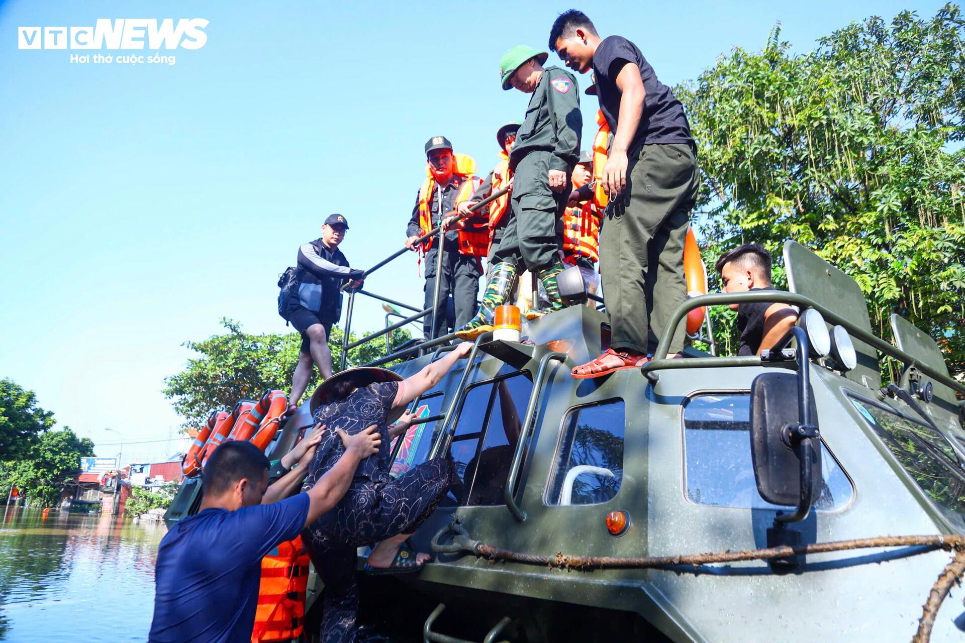 Xe đặc chủng được huy động liên tục đưa người dân ra khỏi vùng ngập sâu, đảm bảo an toàn cho mọi người trong khu vực bị ảnh hưởng bởi lũ.