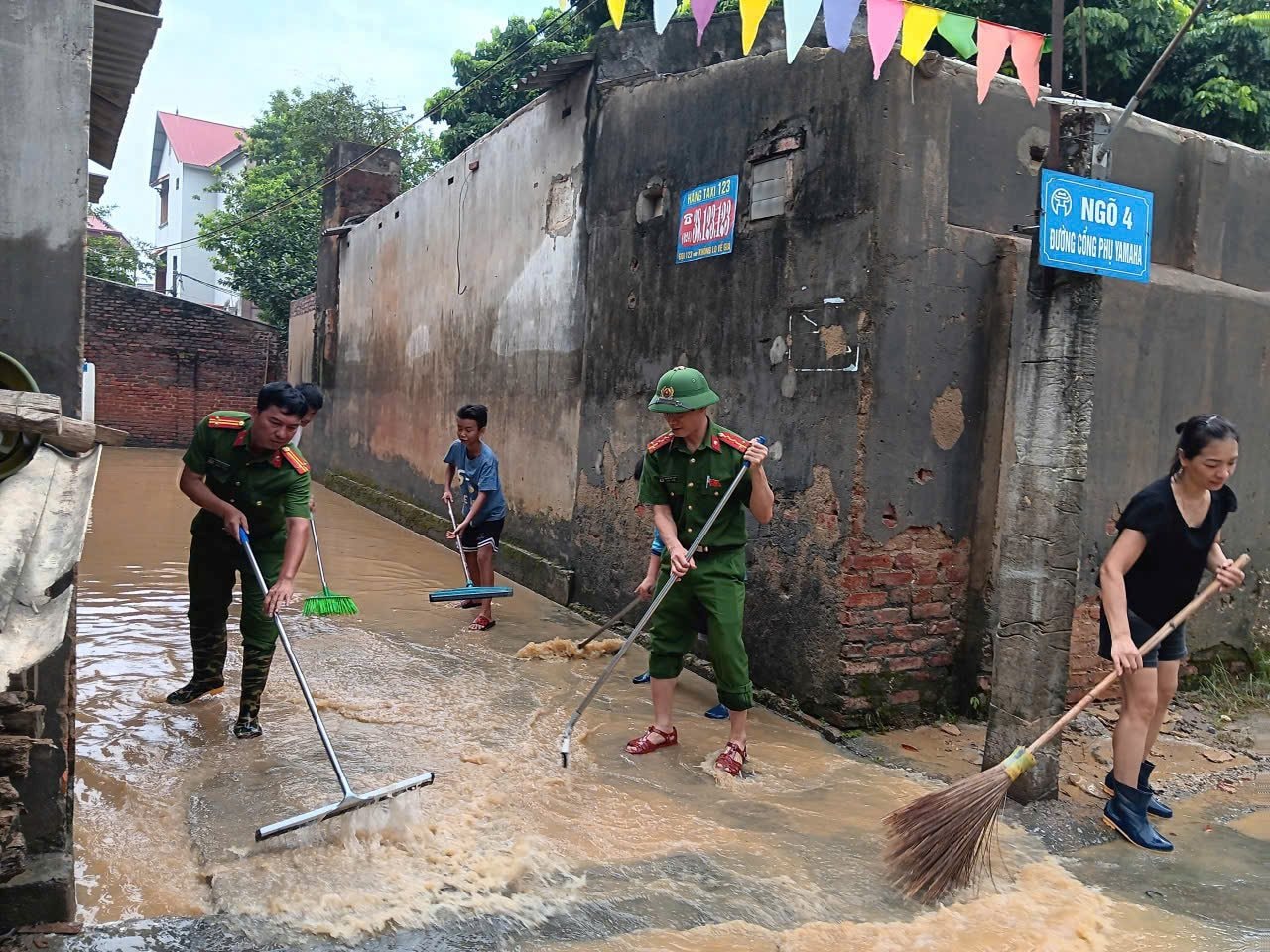 Trong sáng 11/10, ngay sau khi nước lũ rút, cán bộ, chiến sĩ Công an xã Trung Giã và xã Đa Phúc (Hà Nội) đã phối hợp với các đơn vị nghiệp vụ thuộc Công an TP. Hà Nội khẩn trương có mặt tại các khu vực bị ảnh hưởng để hỗ trợ người dân trở về nhà an toàn, thu dọn bùn đất, di chuyển tài sản, dọn dẹp đường làng, ngõ xóm. Hình ảnh đẹp thể hiện tinh thần “vì nhân dân phục vụ”.