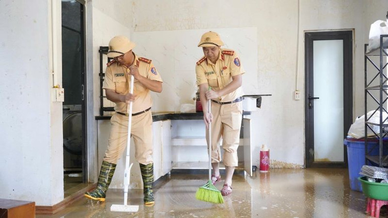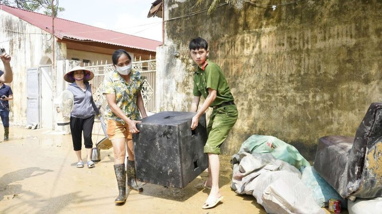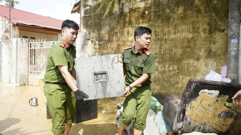 Đối với các khu dân cư, lực lượng Cảnh sát giao thông, Cảnh sát cơ động, Công an xã và đoàn viên, thanh niên trực tiếp đến từng hộ dân hỗ trợ dọn dẹp nhà cửa, di chuyển, sắp xếp lại tài sản, thu gom và phân loại rác thải, khơi thông cống rãnh, dọn sạch bùn đất tại các trục đường, khu vực đình, chùa…