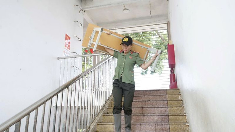 Ban chỉ huy Phòng Hậu cần và Phòng Cảnh sát Phòng cháy chữa cháy và cứu nạn, cứu hộ đã huy động 80 cán bộ, chiến sĩ, một xe chữa cháy và sáu máy bơm công suất lớn để bơm nước, dọn rửa toàn bộ khuôn viên, vệ sinh trang thiết bị giảng dạy.