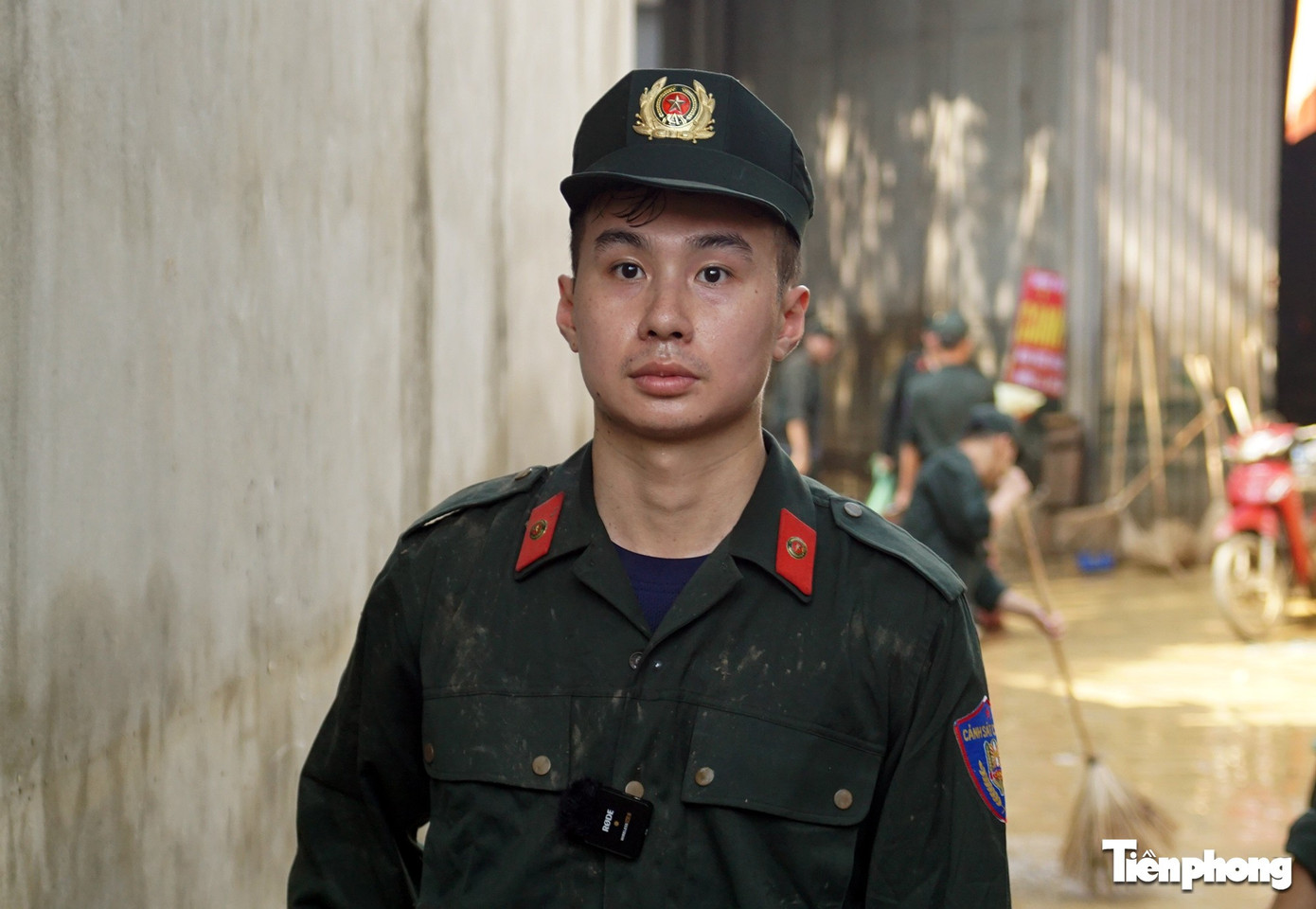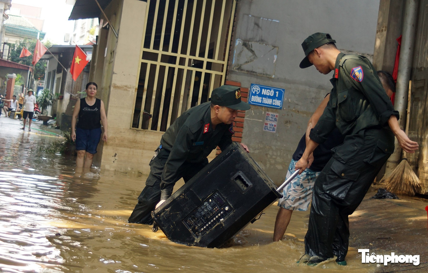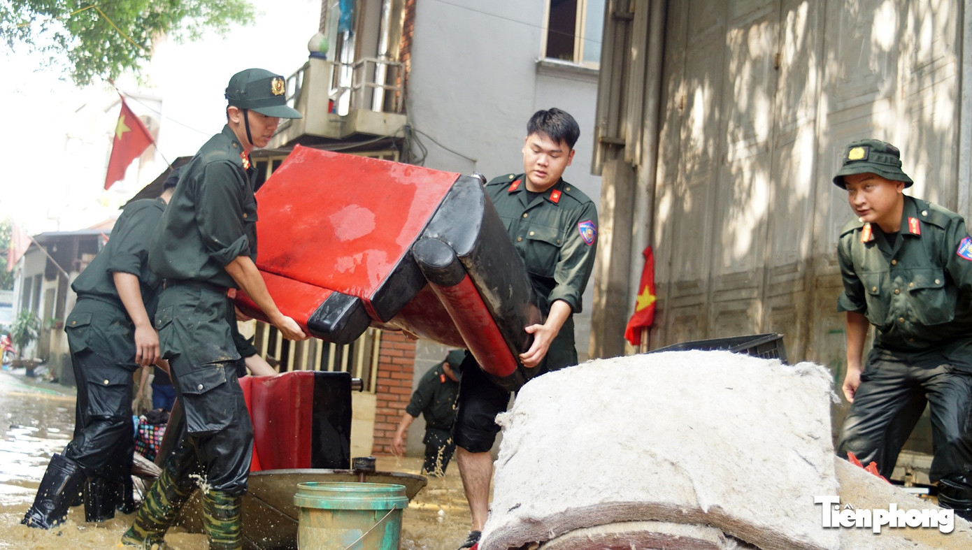 Đến trưa 12/10, khu vực ngõ 1 đường Thành Công vẫn ngập sâu khoảng 40–50cm, nhiều hộ dân trong ngõ bị cô lập. Hàng chục cán bộ, chiến sĩ Cảnh sát cơ động CATP Hà Nội ngâm mình trong nước, giúp người dân di chuyển đồ đạc ra ngoài và dọn dẹp vệ sinh.