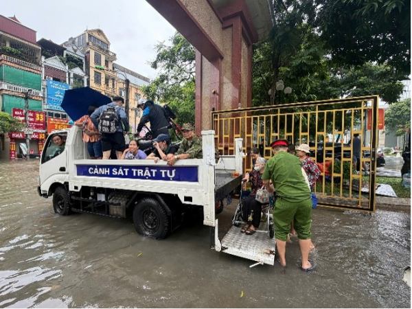 Cảnh sát 113, Cảnh sát trật tự Công an thành phố sử dụng xe chuyên dụng hỗ trợ nhân dân di chuyển an toàn qua nhiều tuyến đường, khu vực ngập sâu.