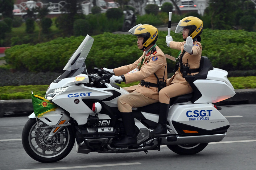 Cảnh sát giao thông Hà Nội trên phương tiện chuyên dụng thực hiện công tác dẫn đoàn.