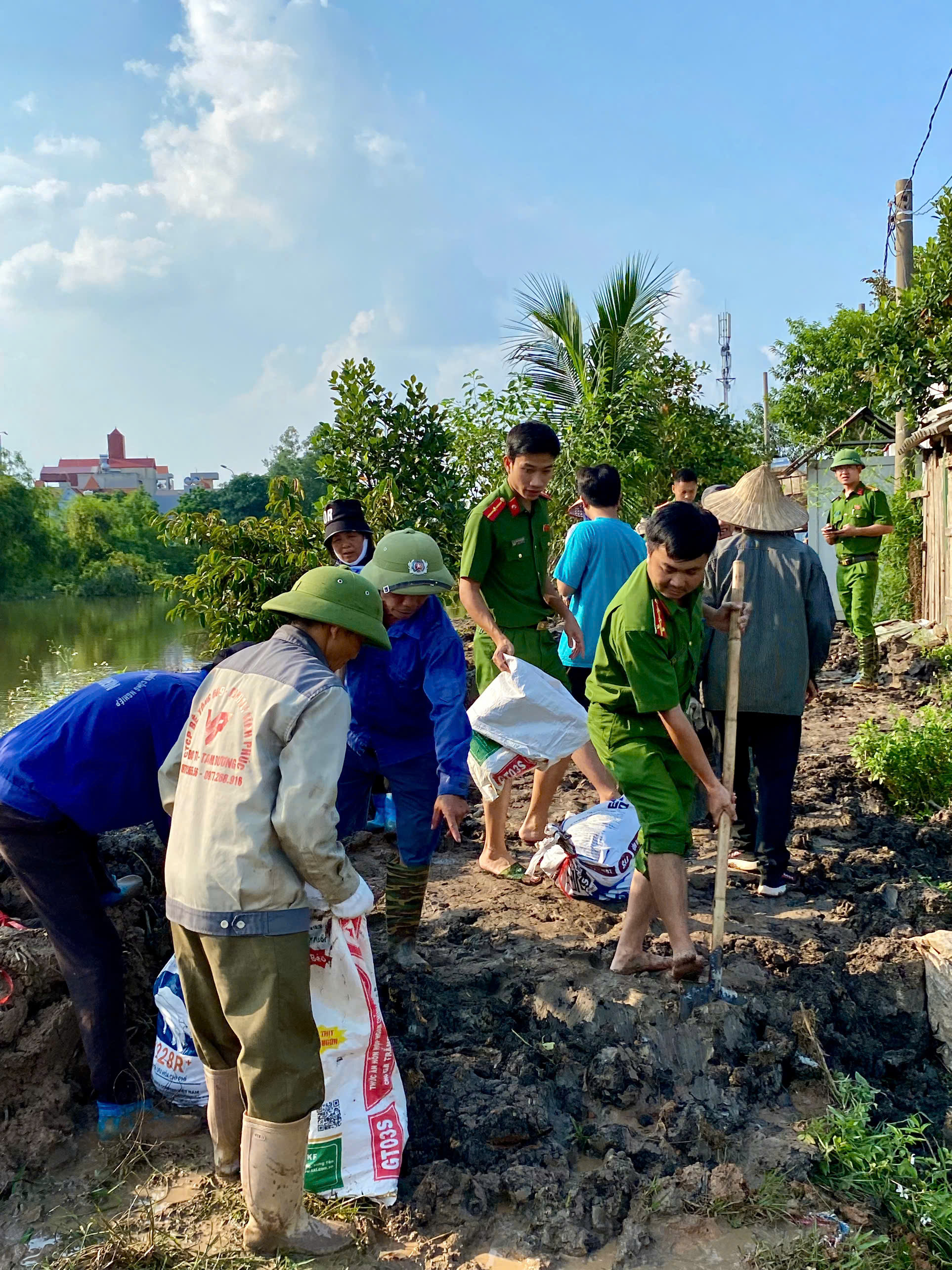 Lực lượng công an cùng người dân triển khai các biện pháp kè bờ, ngăn nước