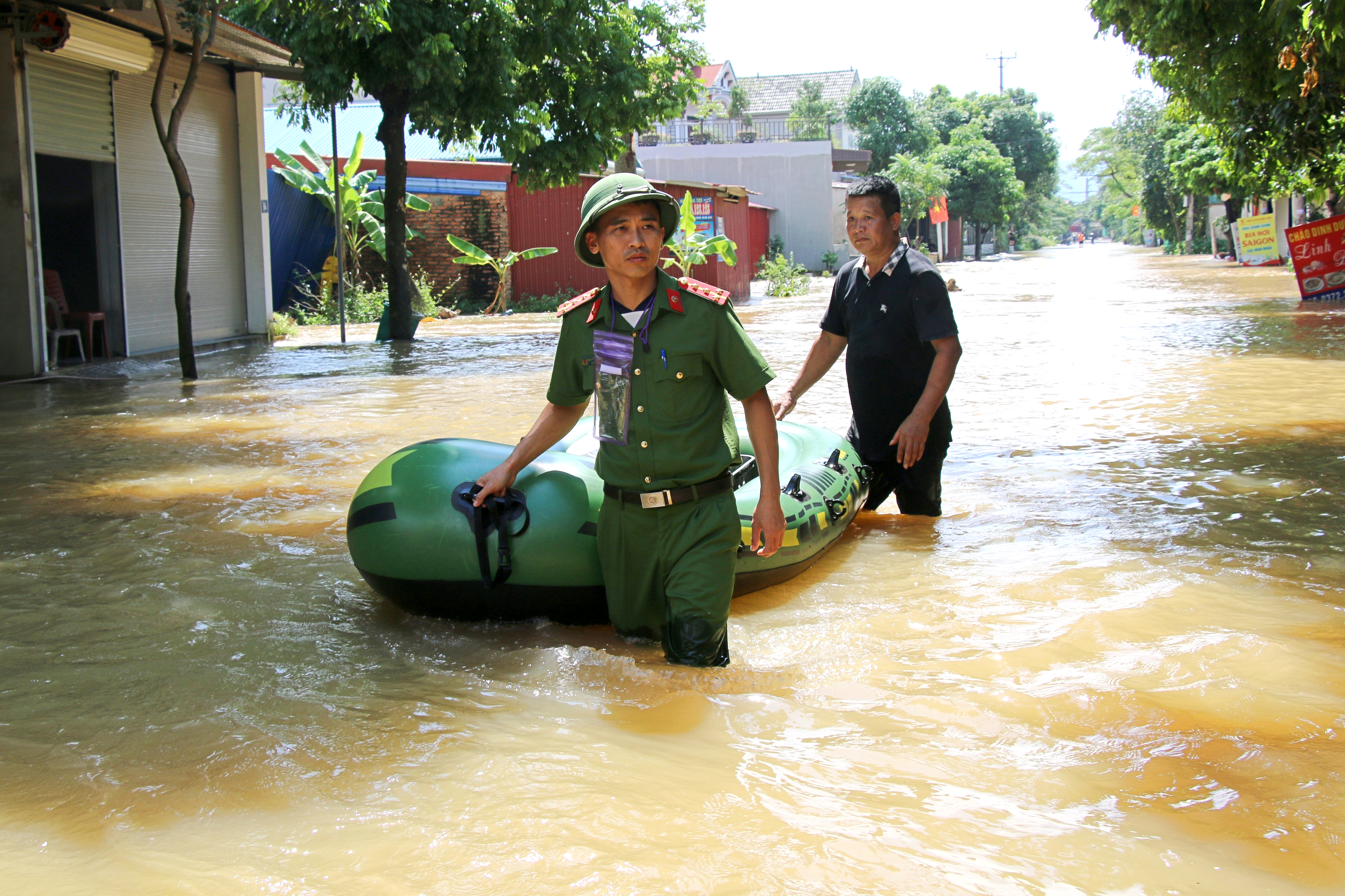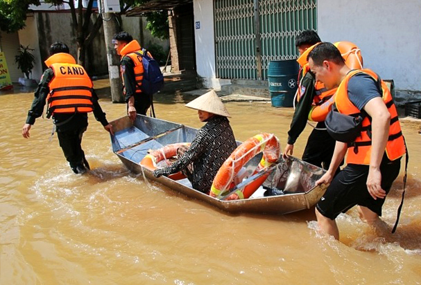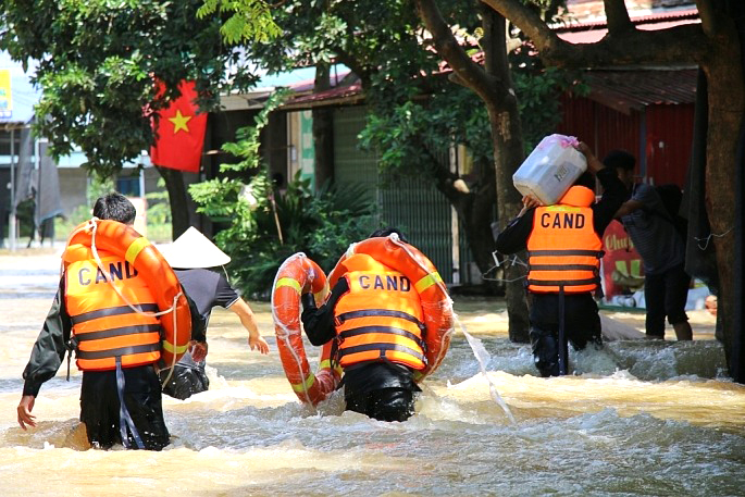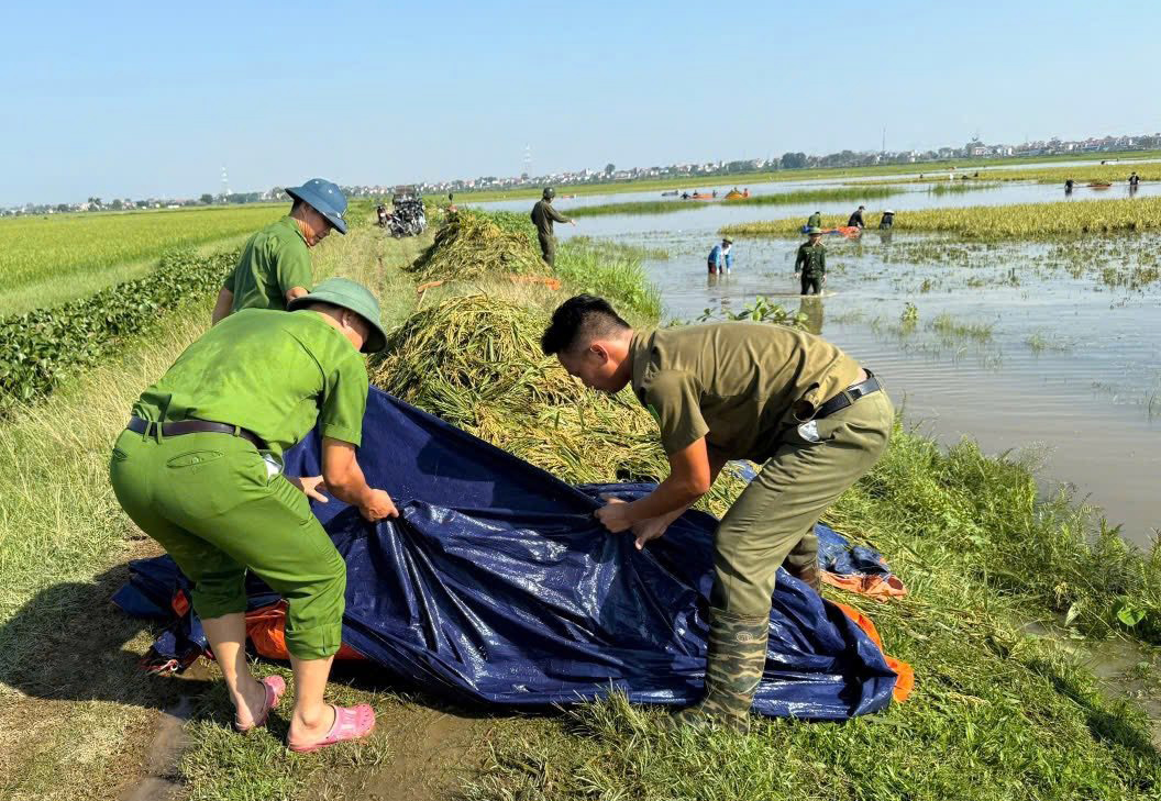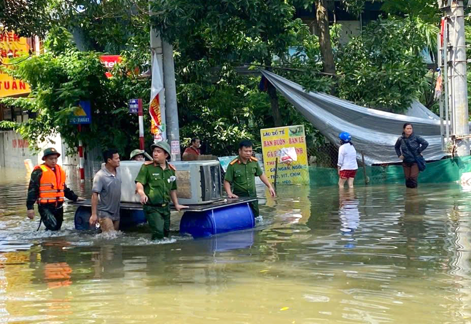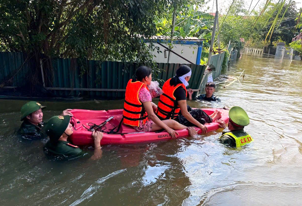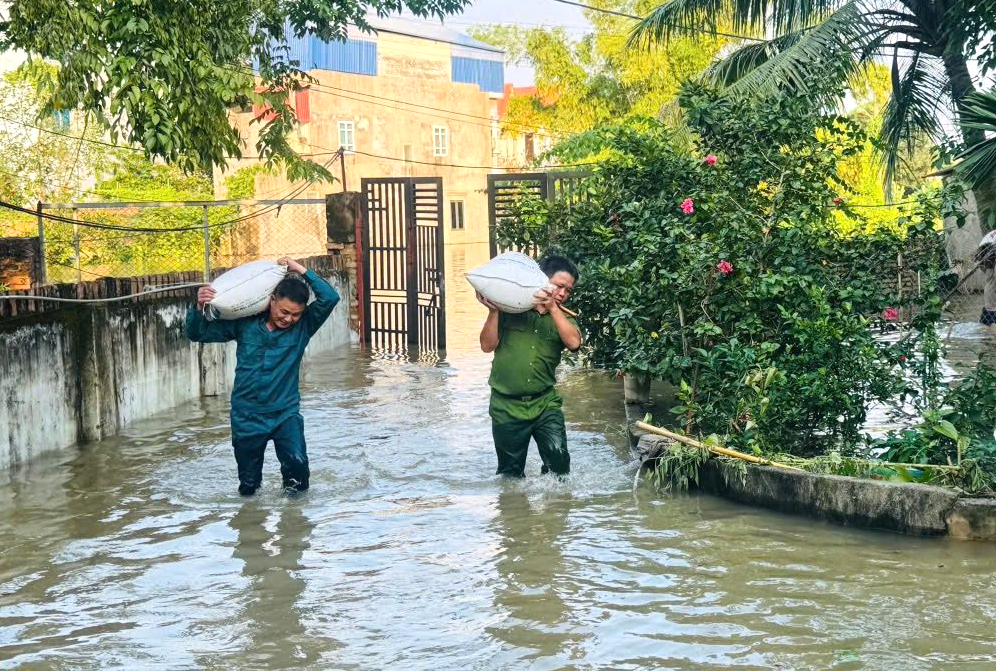 Lực lượng Công an xã đang nỗ lực vào vùng ngập sâu để hỗ trợ người dân bị cô lập đến nơi an toàn, đồng thời tổ chức cứu trợ, hỗ trợ lương thực, nhu yếu phẩm cho các hộ dân bị ảnh hưởng
