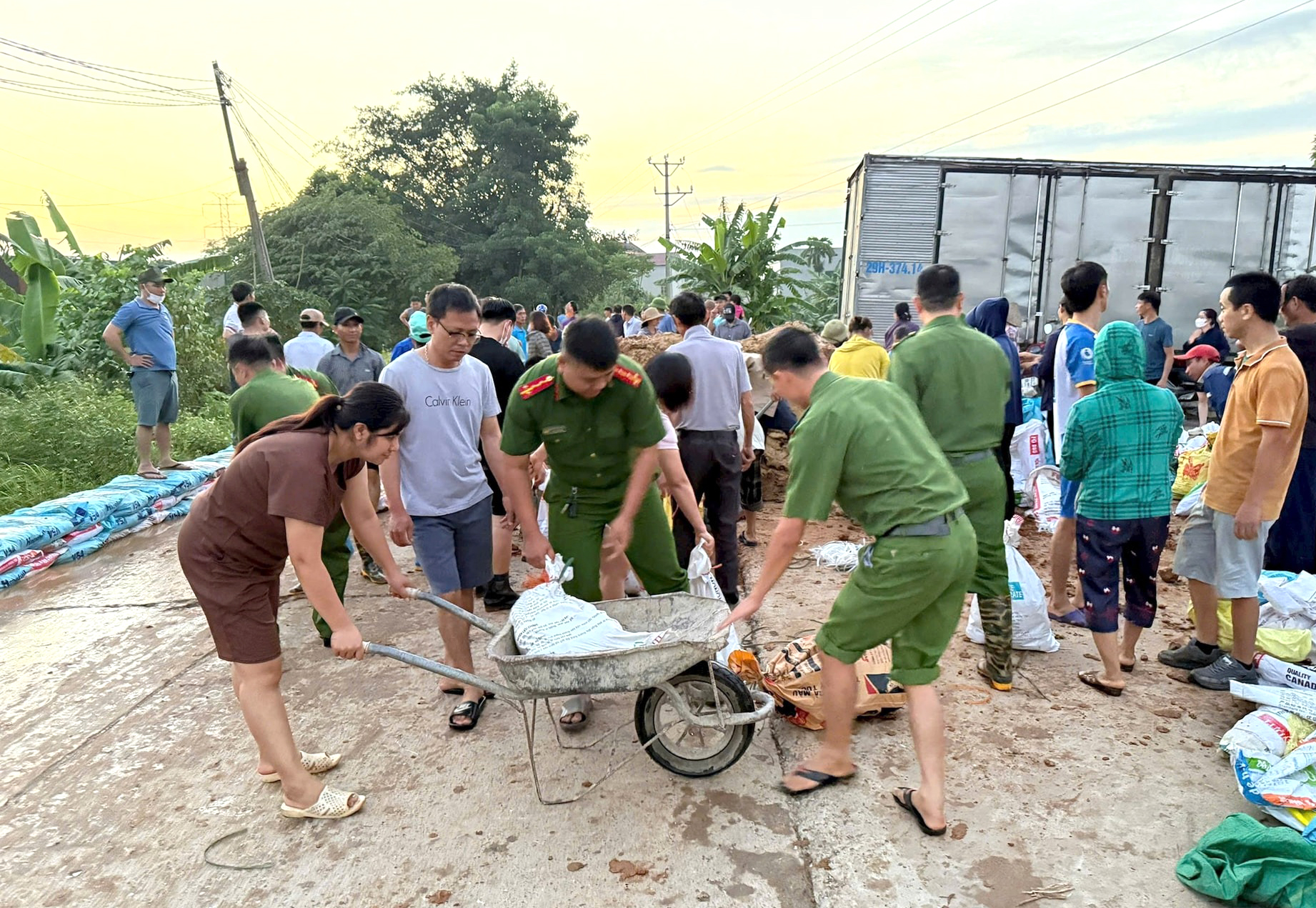 Công an các xã Trung Giã, Đa Phúc phối hợp với chính quyền và các lực lượng khác gia cố tại tuyến đê xung yếu