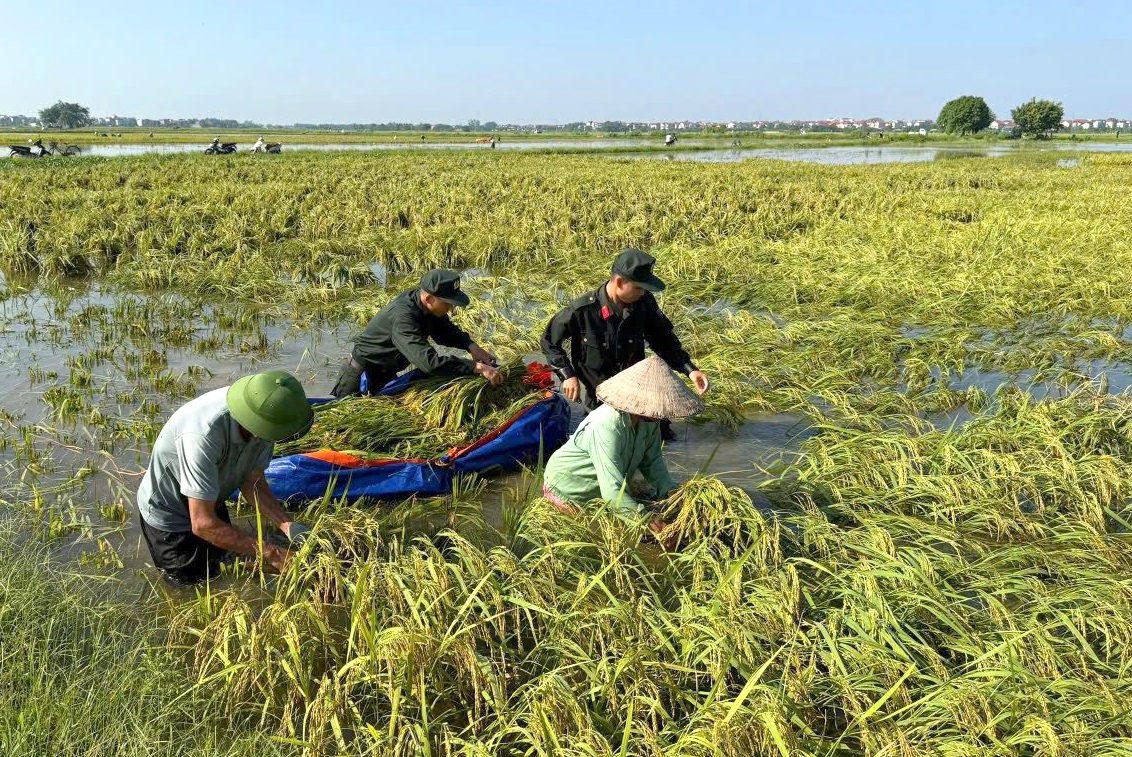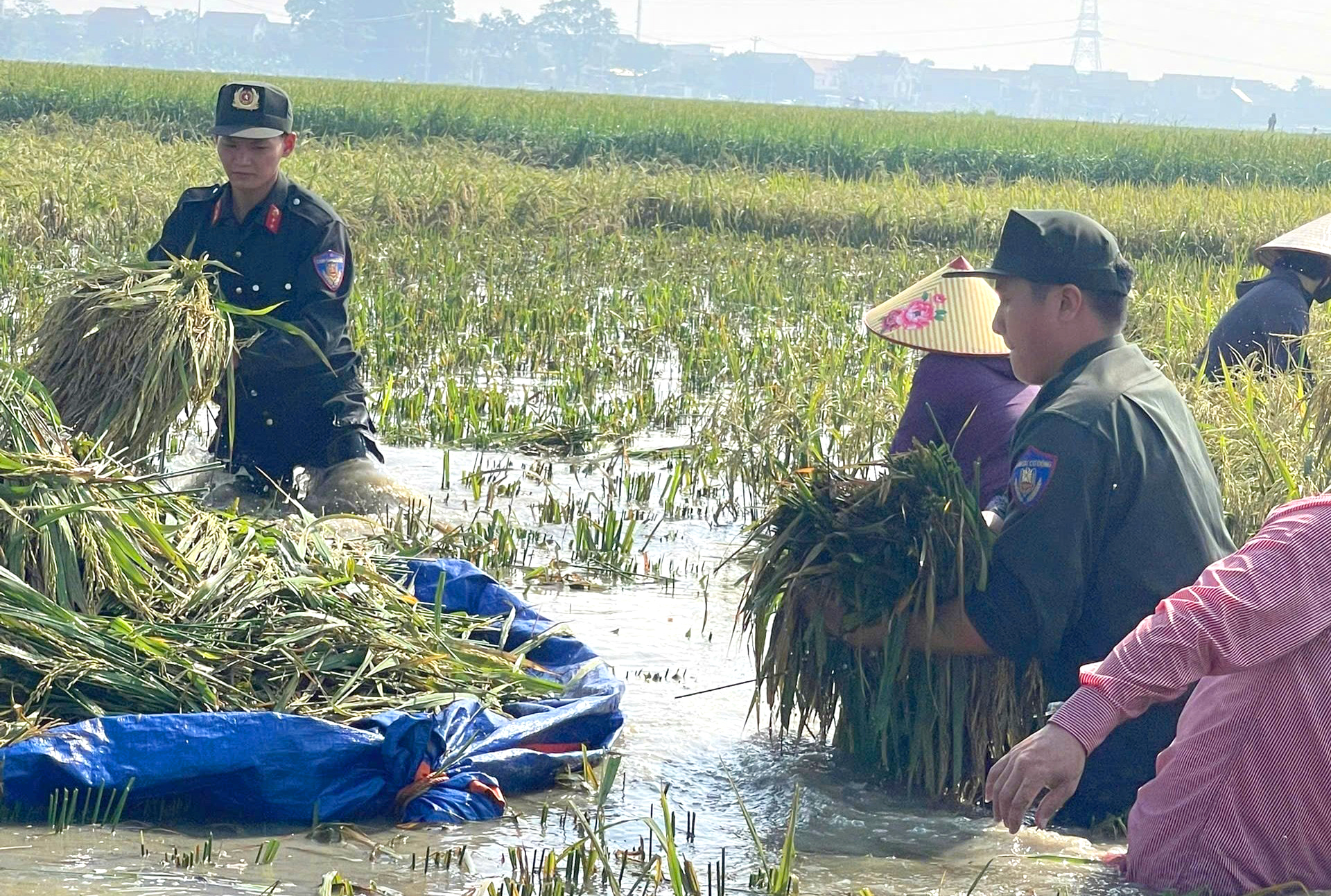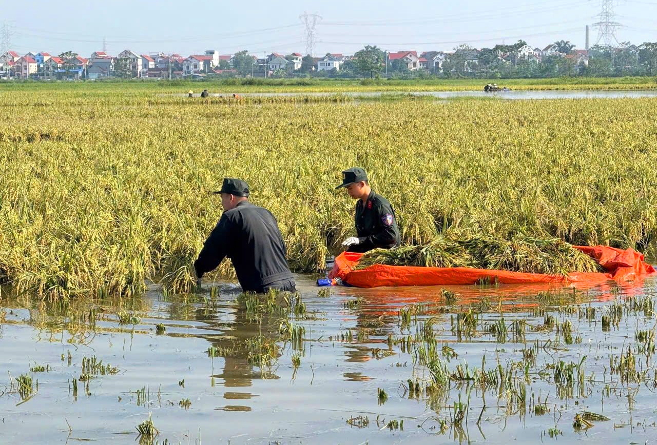 Tiểu đoàn Cảnh sát cơ động số 2, Trung đoàn 22 - Bộ Tư lệnh Cảnh sát cơ động tổ chức giúp đỡ người dân thu hoạch, cắt lúa bị ngập úng, góp phần giảm thiểu thiệt hại sau mưa lũ