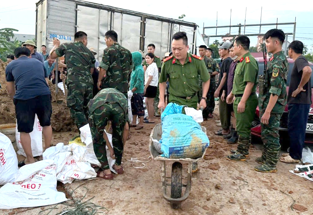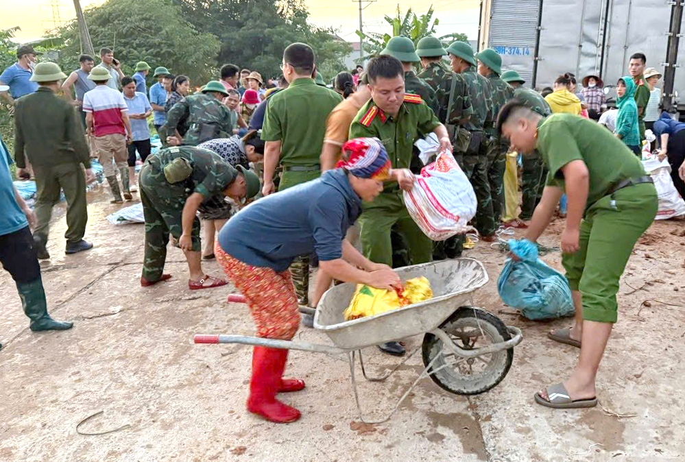 Các chiến sĩ cùng người dân triển khai các biện pháp kè bờ, ngăn nước