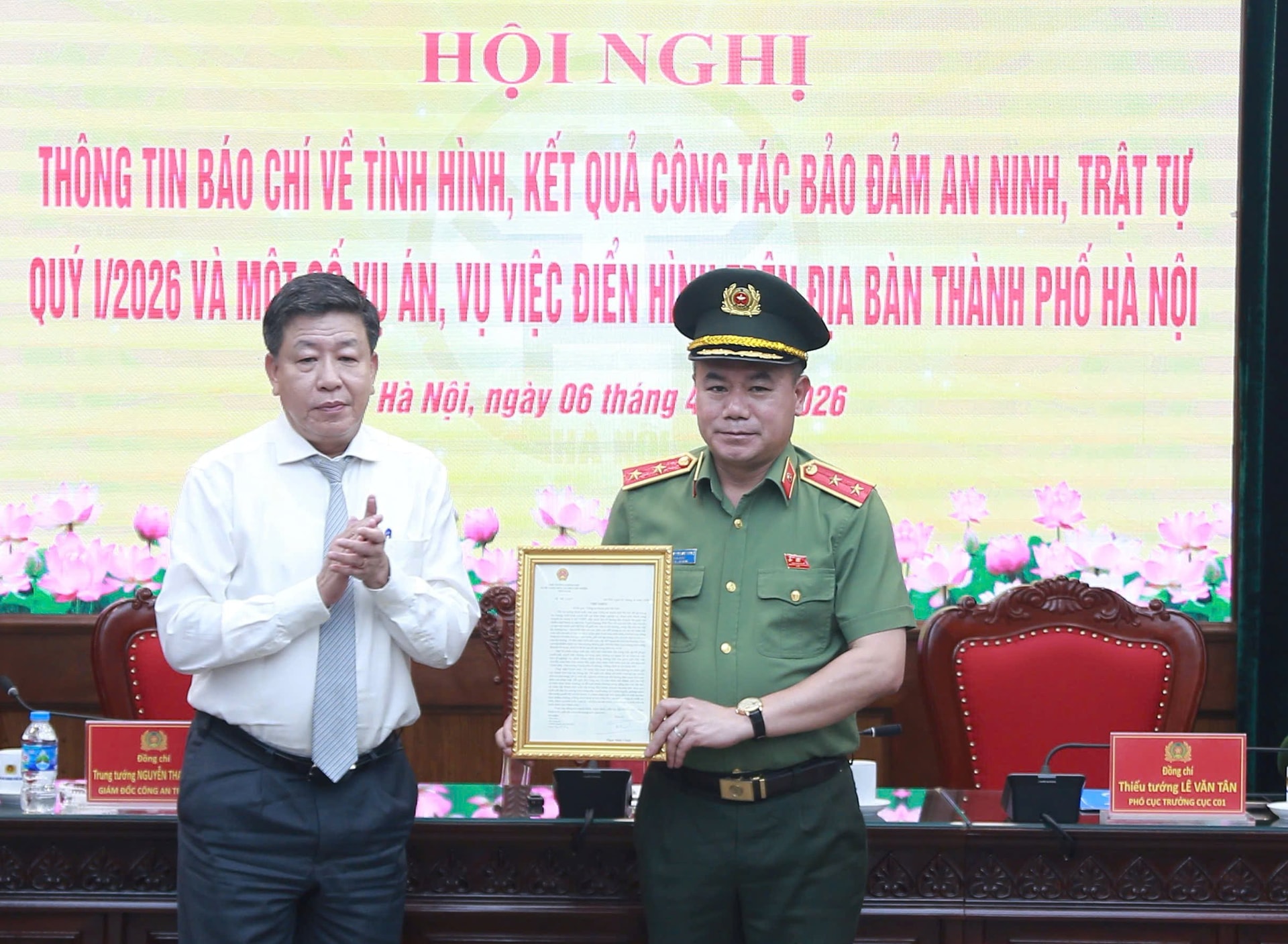 Phó Chủ tịch UBND TP. Hà Nội Dương Đức Tuấn trao thư khen của Thủ tướng Chính phủ cho Công an TP. Hà Nội.