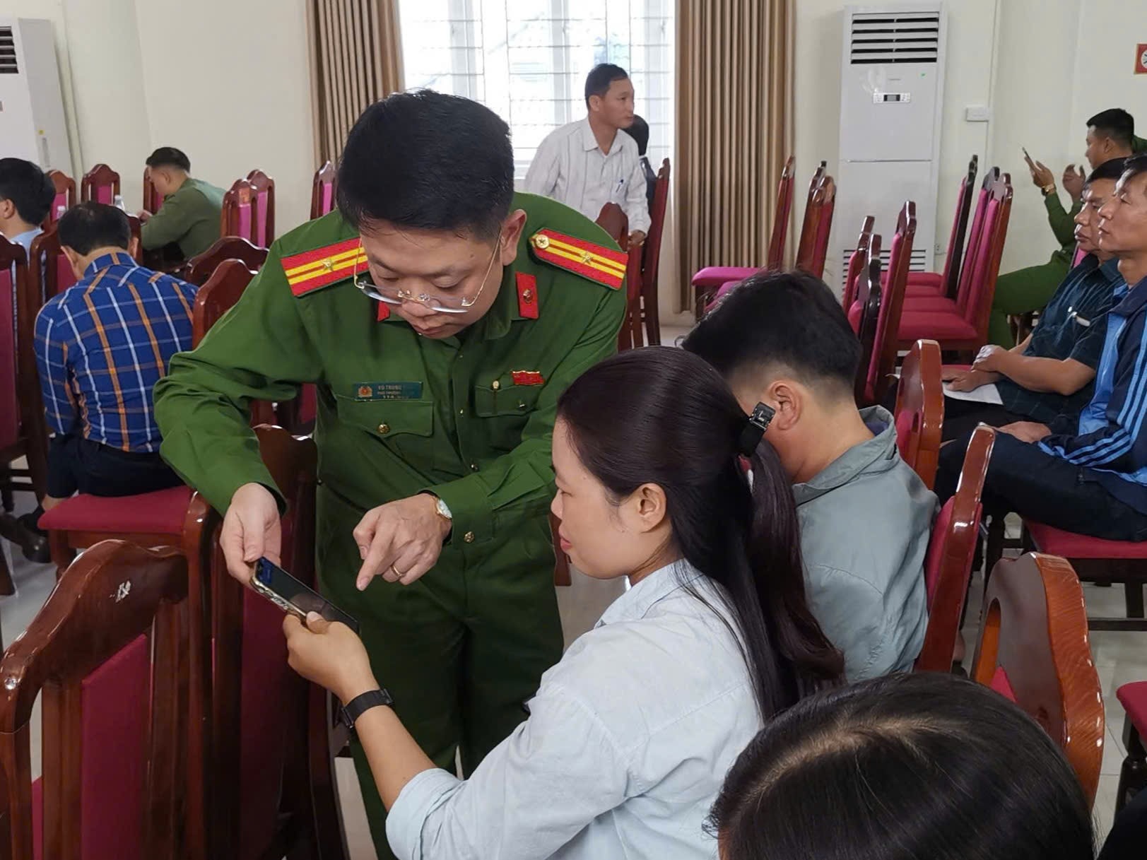 Công an xã Liên Minh tổ chức hướng dẫn cho người dân khai báo trên ứng dụng iHanoi