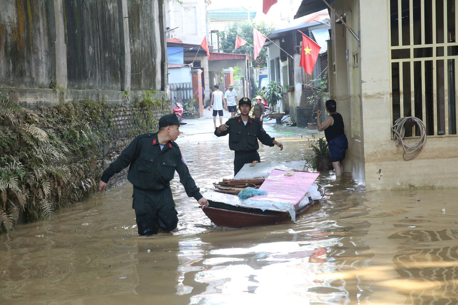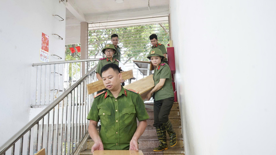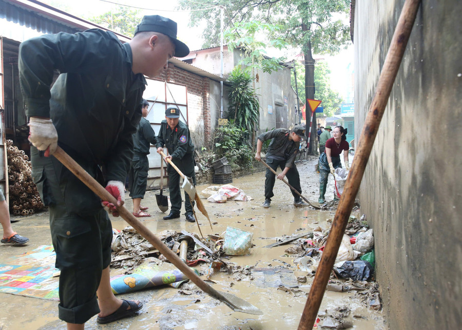Tại các khu dân cư, lực lượng Cảnh sát giao thông, Cảnh sát cơ động - Công an TP Hà Nội, Công an xã và đoàn viên, thanh niên Công an TP Hà Nội trực tiếp đến từng hộ dân hỗ trợ dọn dẹp nhà cửa, di chuyển, sắp xếp lại tài sản, thu gom và phân loại rác thải, khơi thông cống rãnh, dọn sạch bùn đất tại các trục đường, khu vực đình, chùa…