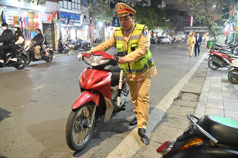 Lực lượng Cảnh sát giao thông, Công an phường Hoàn Kiếm phối hợp tuần tra kiểm soát, bảo đảm trật tự an toàn giao thông, trật tự đô thị trong tối 19/1/1026. Ảnh: Minh Phương