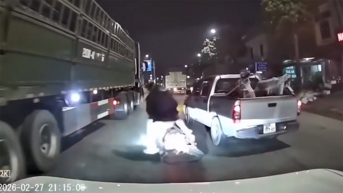Trước đó, đoạn clip dài 27 giây, được ghi vào khoảng 21h15 ngày 27/2, cho thấy một ô tô bán tải (chưa rõ biển kiểm soát) đang lưu thông thì bất ngờ “tạt đầu” xe máy chạy cùng chiều, khiến phương tiện này đổ ra đường.