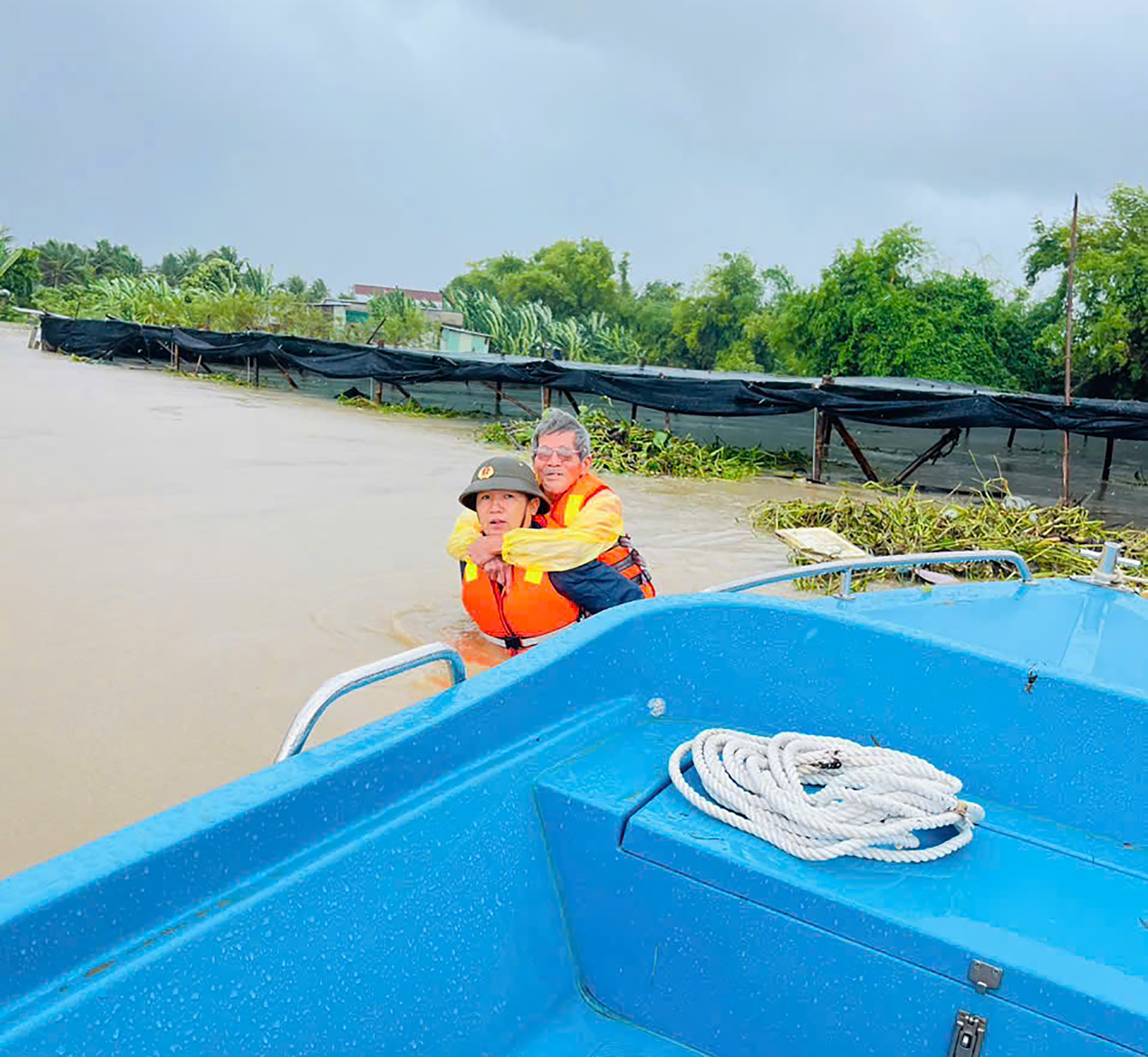 Cảnh sát PCCC&CNCH Công an tỉnh Khánh Hòa đưa người dân ở thôn Phước Thượng, phường Nam Nha Trang ra khỏi vùng lũ lụt.