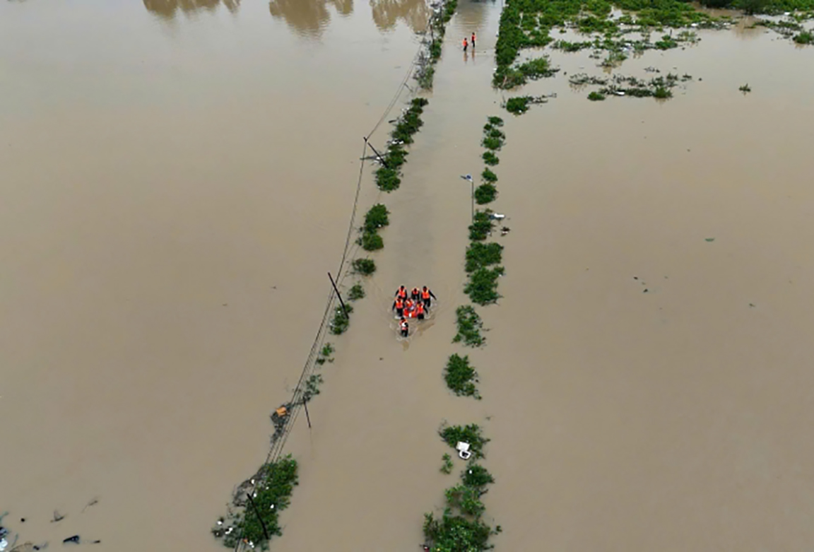 Cán bộ, chiến sĩ Đội CCCNCH khu vực 5 thuộc Phòng Cảnh sát PCCC&CNCH Công an tỉnh Khánh Hòa kết nối dây vào vùng lũ ở thôn Nhĩ Sự, xã Hòa Trí cứu 4 người dân an toàn.