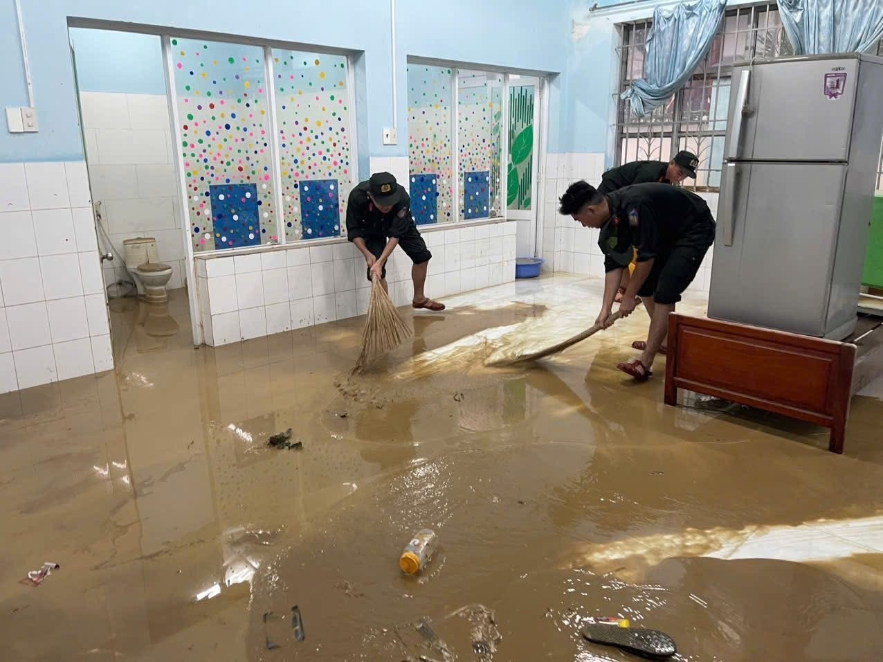 Chiều cùng ngày, Phòng CSCĐ Công an tỉnh Khánh Hòa đã giúp trường Mầm non Vĩnh Trung dọn dẹp sau ngập lụt. Ảnh: ANTV Khánh Hòa.
