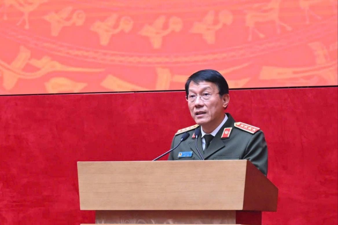 Đại tướng Lương Tam Quang, Ủy viên Bộ Chính trị, Bí thư Đảng ủy Công an Trung ương, Bộ trưởng Bộ Công an phát biểu tại buổi lễ