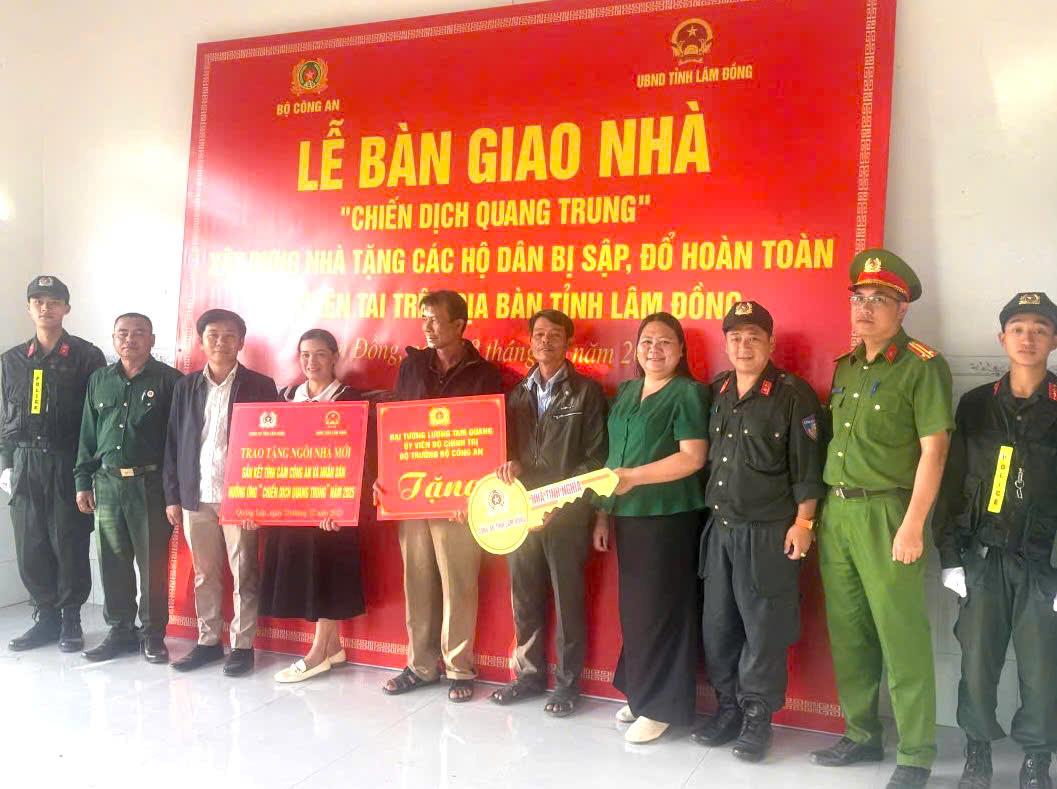 Trước đó, với tinh thần khẩn trương, trách nhiệm và quyết tâm cao, lực lượng Công an đã phối hợp với đơn vị thi công, ngày đêm vận chuyển đất đá, cát vữa và các loại vật liệu xây dựng, hỗ trợ thi công, đẩy nhanh tiến độ, vào sáng 21/12, Công an tỉnh Lâm Đồng đã phối hợp chính quyền địa phương tổ chức lễ bàn giao ngôi nhà đầu tiên trong “Chiến dịch Quang Trung” cho gia đình ông Kiều Đăng Khoa, thôn Hòa Lạc, xã Quảng Lập.