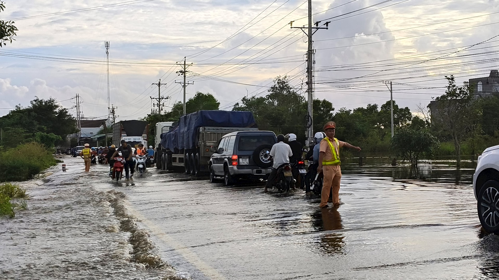 Lực lượng Cảnh sát giao thông điều tiết phương tiện qua vị trí bị ngập nước trên Quốc lộ 28 trong đợt ngập lụt ngày 30/10/2025