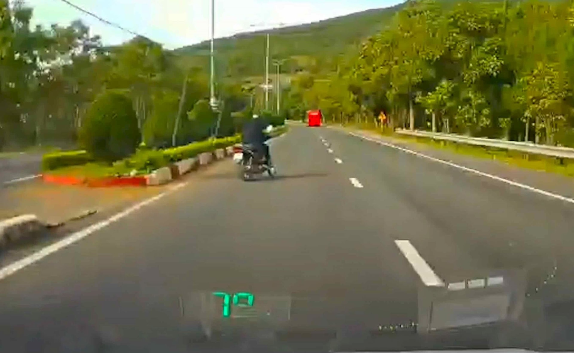 Phát hiện tình huống nguy hiểm, tài xế ô tô phải giảm tốc độ đột ngột để tránh xảy ra va chạm. Sự việc khiến người điều khiển ô tô không khỏi “giật mình” do xe máy xuất hiện bất ngờ trên tuyến đường chỉ dành cho ô tô lưu thông với tốc độ cao.