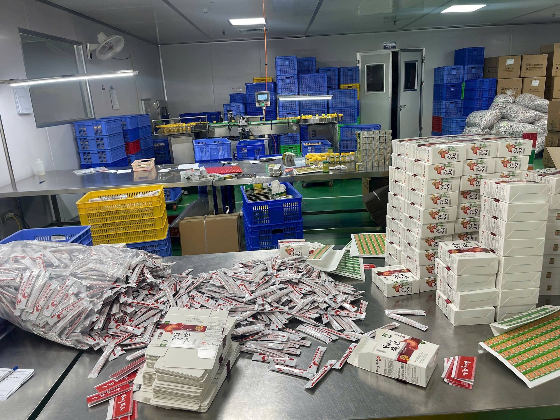 Qua kiểm tra, công an phát hiện hàng nghìn sản phẩm thực phẩm chức năng giả, kém chất lượng đang được sản xuất, đóng gói tại nhà máy thuộc Công ty TNHH Medistar Việt Nam, địa chỉ tại lô 38-2, Khu công nghiệp Quang Minh, xã Quang Minh, TP Hà Nội, chuẩn bị đưa ra thị trường tiêu thụ.