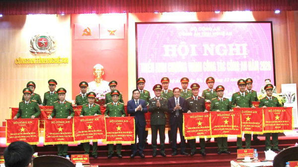 Lãnh đạo Bộ Công an và lãnh đạo tỉnh Nghệ An trao Cờ thi đua của Bộ Công an cho các đơn vị đạt thành tích xuất sắc.