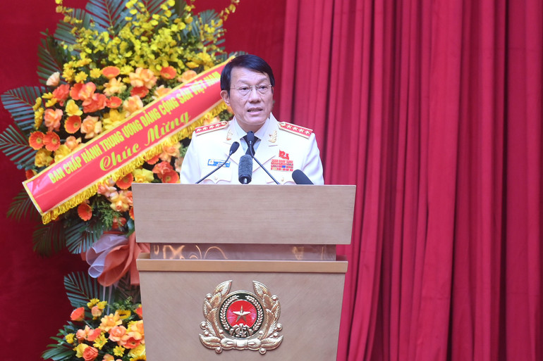 Đại tướng Lương Tam Quang, Ủy viên Bộ Chính trị, Bí thư Đảng ủy Công an Trung ương, Bộ trưởng Công an phát biểu khai mạc Đại hội. (Ảnh: ĐĂNG KHOA)
