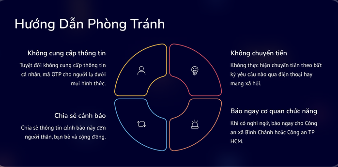 "Người dân cần bảo vệ tài sản và dữ liệu cá nhân, người dân cần ghi nhớ không chụp, không gửi giấy tờ tùy thân cho bất kỳ số điện thoại lạ nào. Không cài đặt ứng dụng qua link gửi trực tiếp, chỉ dùng ứng dụng từ cửa hàng chính thức. Không chuyển tiền cho người lạ dưới bất cứ lý do xử lý hồ sơ nào. Khi được thông báo "hồ sơ đất đai có vấn đề", cần liên hệ trực tiếp UBND xã để xác minh. Tuyệt đối không hoang mang trước lời đe dọa "phạt", "khóa hồ sơ", "truy cứu trách nhiệm" - Công an xã Bình Chánh Khuyến cáo.