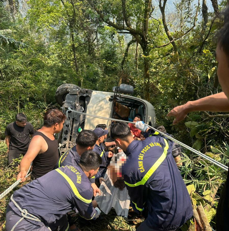 Tại hiện trường, do địa hình taluy dốc đứng, thời tiết mưa ẩm, mặt đường trơn trượt, phương tiện bị lật và biến dạng nên công tác tiếp cận gặp nhiều khó khăn.
