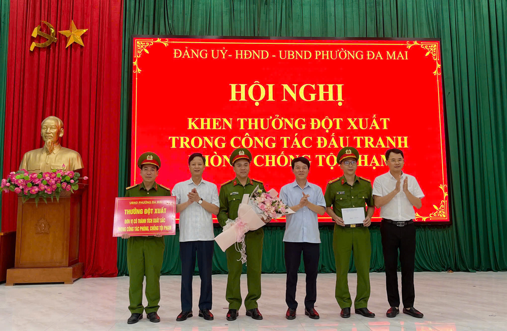 Ghi nhận thành tích xuất sắc của tập thể cán bộ, chiến sĩ Công an phường Đa Mai trong vụ án, chiều 24/4, lãnh đạo Đảng ủy, UBND phường Đa Mai đã khen thưởng đột xuất đối với tập thể Công an phường; đồng thời biểu dương, khen thưởng 3 cán bộ có thành tích xuất sắc gồm: Thiếu tá Hoàng Anh Dũng, Đại úy Thân Quang Tân và Thượng úy Mạc Tuấn Lực.