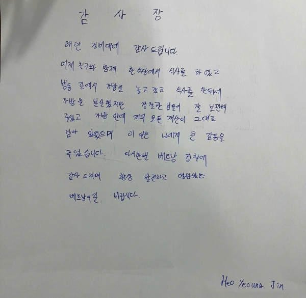 Thư cảm ơn của du khách Hàn Quốc và người dân gửi đến Công an phường An Hải đã kịp thời giúp tìm lại tài sản bị thất lạc.